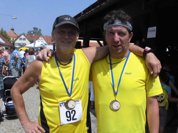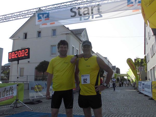 Die Verpflegungsposten nutzte ich jetzt schamlos aus. Einen Becher über den Kopf, einen Becher lauwarmes Cola und einen Becher Wasser zum Mund ausspülen. Steigungen, die ich auf der ersten Runde noch gar nicht bemerkt hatte, machten sich plötzlich schmerzhaft bemerkbar. Ein entgegenkommender Läufer rief mir zu: „Frag mich nicht, wie es meinen Oberschenkeln geht! Die schreien Halleluja!“ – Dieses Befinden konnte ich nur bestätigen. Das war nun eigentlich das Schöne an dieser kleinen Laufveranstaltung. Immer wenn man Gegenverkehr hatte, signalisierte man zumindest mit einem Daumen-Hoch, dass alles in Ordnung war und ab und zu gab es auch aufmunternde Worte. Kurz vor Bad Urach traf ich dann auch wieder auf Charly. Er sah auch schon ziemlich fertig aus, hatte aber Zeit für ein kurzes Erinnerungsfoto. „Lass Dir Zeit“, meinte Charly – „Ja, wir treffen uns im Ziel“ und weg war er.