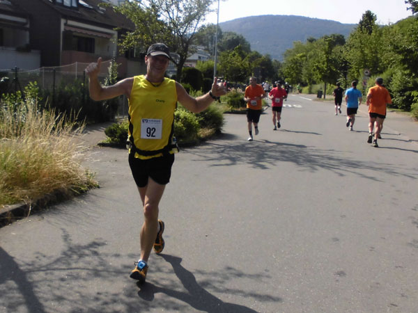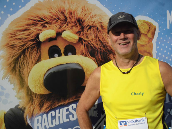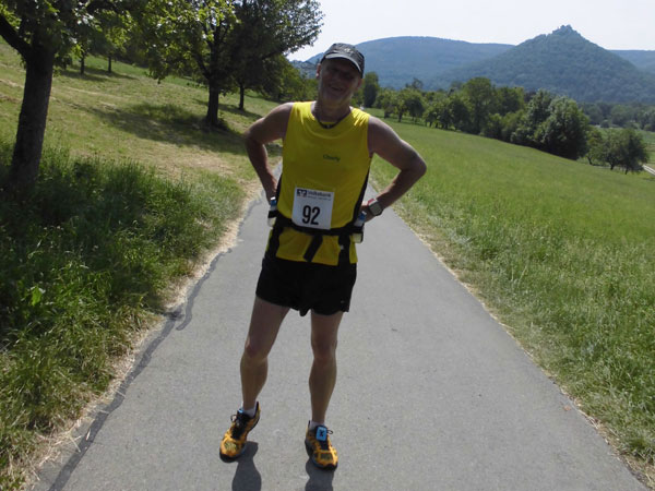 Bad Urach hatte ich planmäßig erreicht. Vorbei an Ferienwohnungen und Bungalows erreichten wir schnell das Schulzentrum mit der Sportanlage. Dort war der Wende-punkt, der mit einer Runde auf der Tartanbahn geschafft war. Nun ging es zurück nach Metzingen. Ich hatte einen ersten Eindruck von der Strecke und wusste nun ganz genau, was auf mich zukam. Es sollte nicht einfach werden, das war mir klar. Ständig leichte Steigungen und Gefälle, dazu die strahlende Sonne mit der damit verbundenen Temperatur, ja da hieß es langsam tun und viel Flüssigkeit aufnehmen. Auch Charly hatte ich kurz vor dem Wendepunkt noch gesehen. Da er nur ein paar hundert Meter Vorsprung hatte, war mir klar, dass auch er einen Gang zurückgeschaltet hatte.