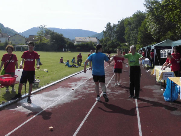 Nachdem ich die Obststreuwiesen wieder hinter mir gelassen hatte, lief ich in Dettingen zum letzten Mal am Freibad vorbei – ein neidischer Blick nach rechts inbegriffen – und freute mich schon auf die Verpflegungsstation auf dem Sportplatz. Doch erst mal verstand ich gar nichts mehr. Als ich um die Ecke bog, war die komplette Stadionrunde voll mit Walkern. Was ist das denn?