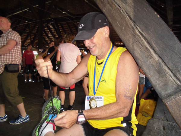 Die Sanitäter hatten wohl bei diesen Bedingungen auch ordentlich was tun. Zahlreiche Teilnehmer mussten erschöpft aufgeben, so dass letztlich auch nur 86 Marathonis das Ziel erreichten. Charly und ich hatten also alles richtig gemacht, schließlich hatten wir das Ziel erreicht. |