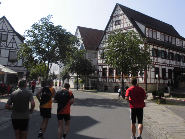 Ich nutzte die Zeit, um mich zeitlich erst mal richtig einzusortieren. Ich wollte ja heute schön piano laufen und das ist gar nicht so leicht, wenn man von Halbmarathonis umgeben ist. Aber bis Dettingen hatte ich das ganz gut hinbekommen. Dort liefen wir durch die schöne Altstadt, vorbei am Schlössle, dem heutigen Rathaus, sowie wie an zahlreichen Fachwerkhäusern. Die Straßencafes hatten schon geöffnet und waren gut besucht. Auch hier bekamen wir genug Applaus. Am Ortsende liefen wir noch auf der Tartanbahn des Dettinger Sportplatzes eine halbe Runde. Dort war eine der vielen Verpflegungsstationen aufgebaut und zudem war die Hälfte des ersten Streckenabschnittes erreicht.