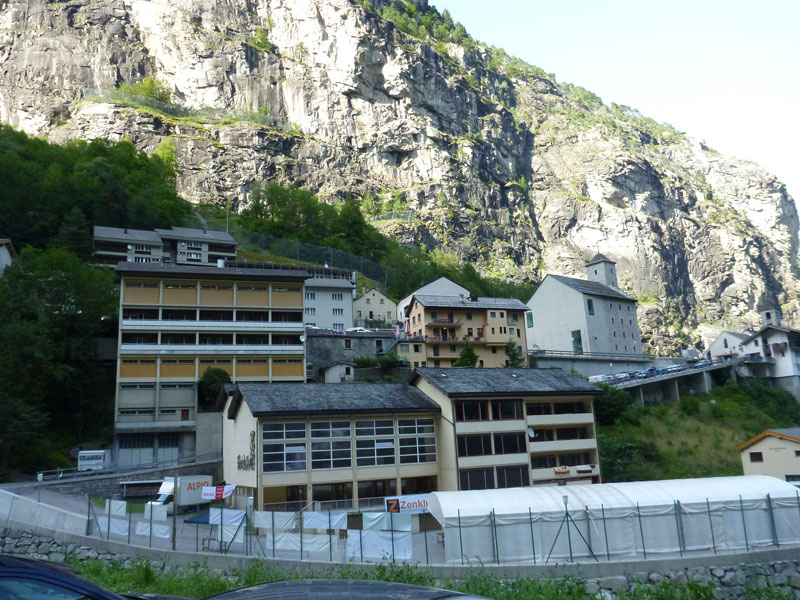 Jan und ich wollen die Möglichkeit aber nicht nützen, bei dem wunderschönen Wetter möchten wir vorab schon mal den Übergang auf der Passhöhe begutachten. der auch der bestausgebaute Passübergang der Schweiz ist. Damit hat er sich auch zu einer Transitstrecke für den Schwerverkehr entwickelt, die jährlich von zigtausend LKWs befahren wird. Obwohl es sich um eine Nationalstraße handelt, darf man ihn aber auch mit dem Fahrrad überqueren. Diverse Baustellen behindern aber gerade ein zügiges Vorwärtskommen.