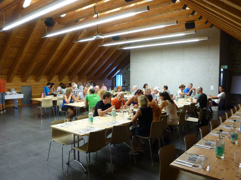 Die angesagten Gewitter treffen passend ein: nämlich geraume Zeit nachdem der letzte das Zielbanner passiert hat. Ab 17:15 Uhr kann im Schulhaus das Abendessen eingenommen werden. Nicht einfach nur Nullachtfuffzehn, sondern zubereitet von einer ortsansässigen Metzgerei gibt es zu den Maccaronis noch mehrere Scheiben Fleisch, dazu Salatteller, Brot und Früchtejoghurt.