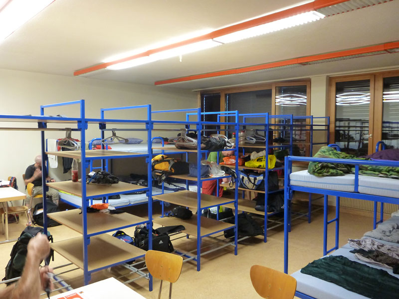 Den bietet uns der direkt neben dem Ziel gelegene Zivilschutzbunker unter dem Schulhaus. Momentan kann ich mir nicht vorstellen, am morgigen Tag dasselbe zu wiederholen. Zwei große Schlafräume stehen in der Zivilschutzanlage zur Verfügung, ähnlich ausgestattet wie schon das Schulhaus in Gondo. Auch hier steht reichlich Platz zum Ausbreiten der Ausrüstung zur Verfügung, die nassen Sachen können im Waschraum aufgehängt werden und eine Steckdose findet sich auch, so können mit mir, auch meine Akkus wieder regenerieren. An das Getöse der Lüftungsanlage muss man sich erst gewöhnen, die Wiederholungstäter kennen sich hier schon besser aus, viele sind mit Sack und Pack in die überirdische Turnhalle der Schule gezogen, eine sogar ins Freie direkt vor dem Eingang. Nach einer Dusche und Erholungspause bin ich wieder fit und die Lebensgeister kommen zurück.