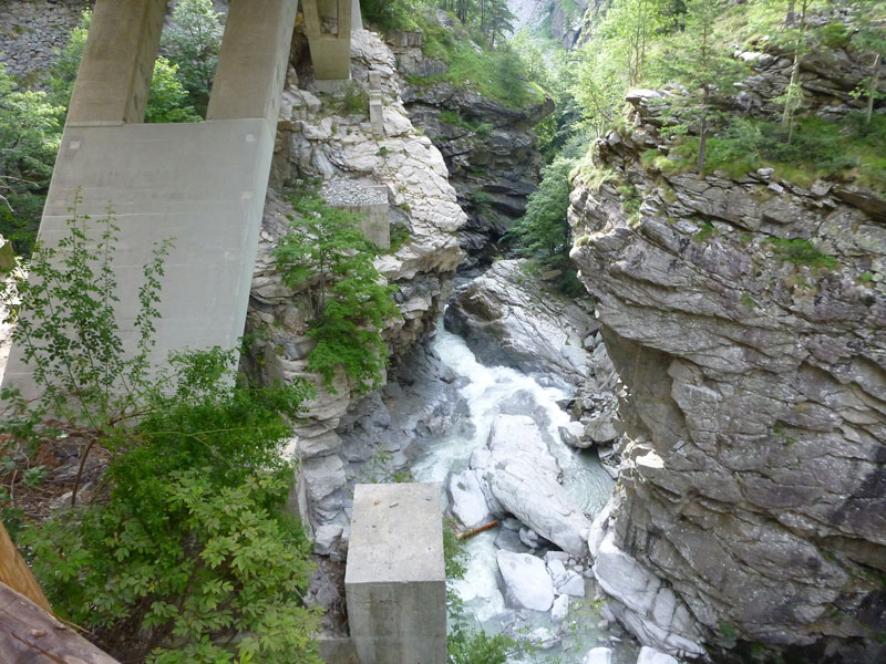 Holz- und Steinbrücken wechseln mit modernen Stahlkonstruktionen, die aktuellen, aber auch früheren Wegebauer haben hier einen aufregenden Pfad durch die Schlucht geschaffen, kaum zu glauben dass Stockalpers Männer hier ihre Handelsroute durchführten. Erst seit August 2002 ist der Weg durch die imposante Schlucht wieder für die Öffentlichkeit zugänglich gemacht worden. Stehenbleiben ist aber an diversen Stellen wegen Felssturzgefahr untersagt. Haben wir ja auch nicht vor.