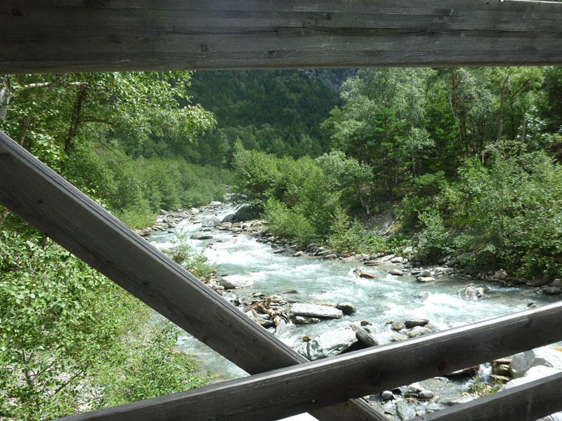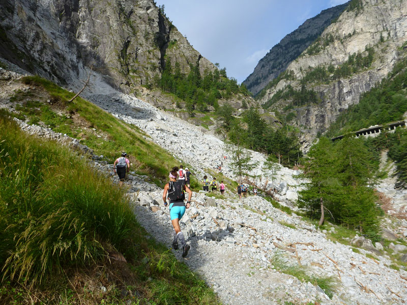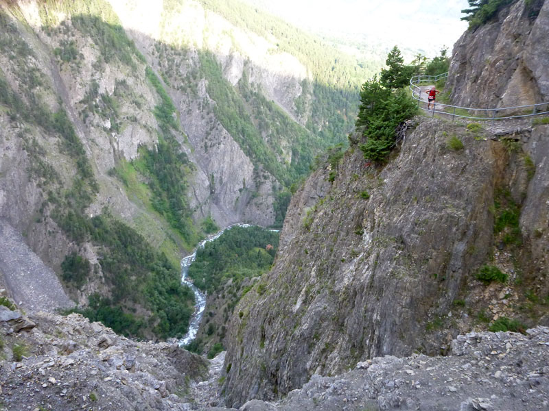 Um die unbezwingbare Saltinaschlucht zu umgehen, musste Stockalper seinerzeit den obenliegenden Weg in den Schallberg führen. Für uns eröffnet sich ein imposanter Blick auf die weit unten fließende Saltina. Wenig später erreichen wir die erste Verpflegungsstelle. Ab hier nur mehr mäßig steigend gleiten wir wellenförmig durch Wald- und Wiesenabschnitte. Auch der eine oder andere Asphaltkilometer ist zu passieren.