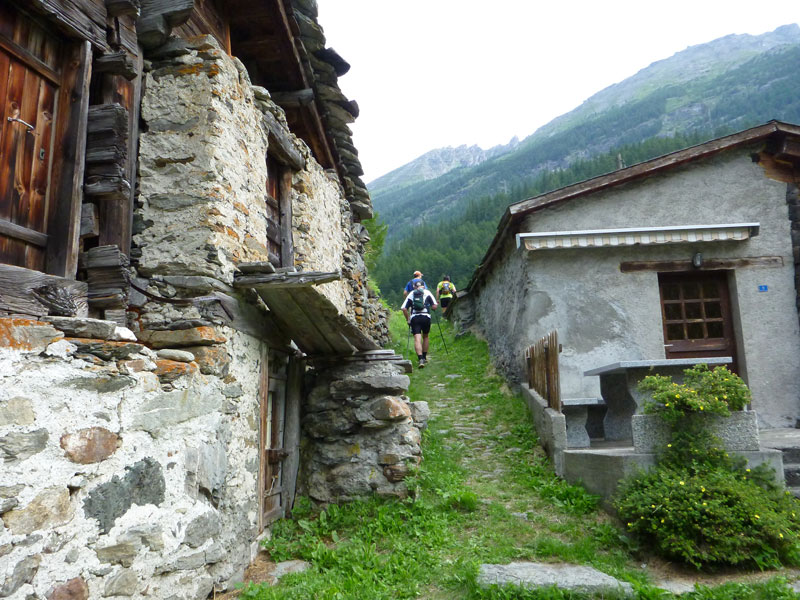 Die ersten 500 Höhenmeter liegen in Simplon Dorf (km 8,5) hinter uns. Der Baustil mit den typischen Steinplattendächern erinnert an seine italienische Nachbarschaft. Wir laufen mitten durch den Dorfkern. Am Ortsende ist die zweite Versorgungsstation errichtet. Es stehen Cola, Iso, Wasser, Linzer Törtchen, Salzbrezeln, Bananen und Riegel zur Verfügung.