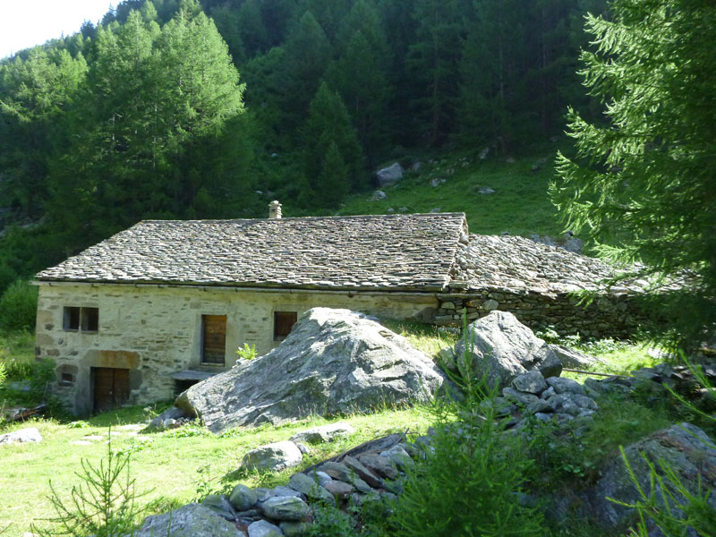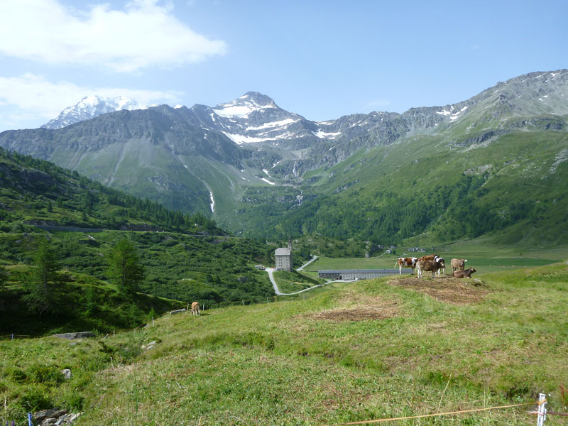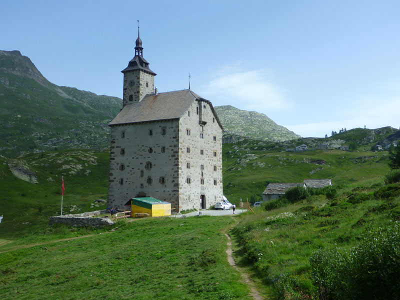 Über saftige Alpweiden, rauschende Bäche und auch immer wieder kleine Ansiedelungen, wo wir manchmal gefühlsmäßig durch den Garten spazieren, führt der Weg beständig nach oben. Es wird aber auch zunehmend steiniger und steiler. Schon von weitem kann man das hochaufragende Alte Spittel erkennen. Es wurde 1650 von Kaspar Stockalper erbaut und diente als Herberge für Wanderer und Kaufleute. Die drei oberen Stockwerke nützte seine Familie als Sommersitz. Im untersten wurde armen Reisenden unentgeltlich Unterkunft und Verpflegung gewährt.