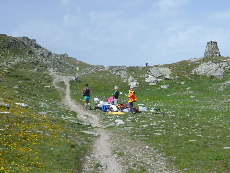 Einige alpine und daher nur vorsichtig passierbare Abschnitte beeinträchtigen das Vorwärtskommen doch spürbar. In einer Senke kann ich mich nur mehr an den zahlreichen Fähnchen orientieren, der vor mir liegende Wiesentrail ist als solcher kaum mehr erkennbar, er führt durch eine fast unberührte Graslandschaft, nur das nieder-gedrückte Gras unserer Vorläufer machen ihn noch als unsere Laufstrecke erkennbar. Aber die Route ist vorbildlich ausgeschildert und Verlaufen eigentlich unmöglich. Kurz unterhalb des höchsten Punktes wird es nochmal richtig steil. In der Mittagshitze nicht unbedingt ein Vergnügen, ich bin froh, zu den eigentlich vielen VPs, noch zusätzlich meinen Trinkrucksack aufgefüllt zu haben. Recht unspektakulär präsentiert sich der Übergang am Bistinenpass, nur eine Steinpyramide deutet auf einen besonderen Punkt hin. Eine Labestation versorgt uns mit allem was benötigt wird.