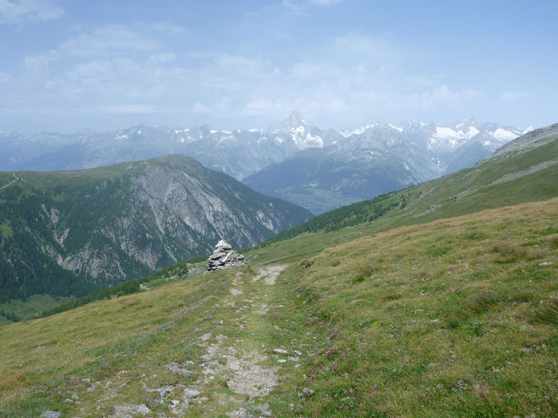Bis zum höchsten Punkt unseres Kurses, dem Bistinenpass auf über 2.400 m liegen noch 6 km und über 600 Hm vor uns. Der Weg hinauf führt in einem weiten Bogen oberhalb des Simplon-Plateaus an den Flanken des Tochuhorn und Magehorn entlang. Nicht übermäßig steil, aber immer in steiniger Hanglage sollte man schon Vorsicht walten lassen. Je höher wir kommen umso beeindruckender wird die Aussicht, nach oben präsentieren sich die Berggipfel des Monte Leone, Wasenhorn und Fletschhorn, unter uns schlängeln sich die Serpentinen des Simplon über die Passhöhe.