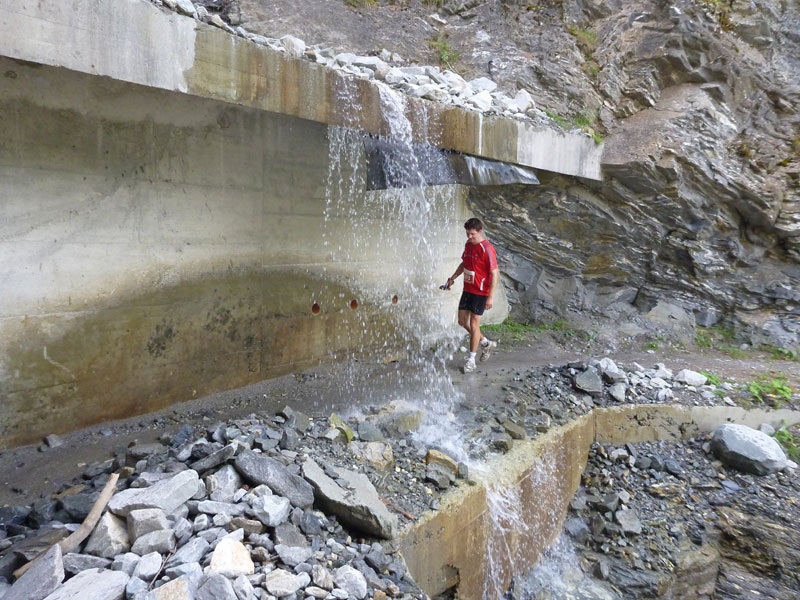 Einer der Höhepunkte des 1. Tages und ein besonderes Schmankerl beim Gondo Event ist die Durchquerung der Saltina. Ja, schon richtig gelesen: Durchquerung. Auch wenn mittlerweile die Brücke über den Gebirgsbach wieder aufgebaut ist, so wird sie doch im Normalfall von den Läufern nicht beachtet. Enorme Regenfälle ließen im Oktober 2000 die Saltina so anschwellen und reißend werden, dass sie auch vor der Brücke keinen Halt machte und sie komplett zerschmetterte. In Gedenken daran müssen die Teilnehmer, von der ansässigen Feuerwehr gesichert, direkt durch den Gebirgsbach. Ich bin richtig enttäuscht, als man mir mitteilt, dass dies heute zu gefährlich ist, da die Strömung zu stark ist. Dabei hatte ich mich doch schon so auf spektakuläre Bilder mit meiner wasserdichten Kamera gefreut und zudem bei diesen Tropentemperaturen auf die Erfrischung in den kühlen Fluten.