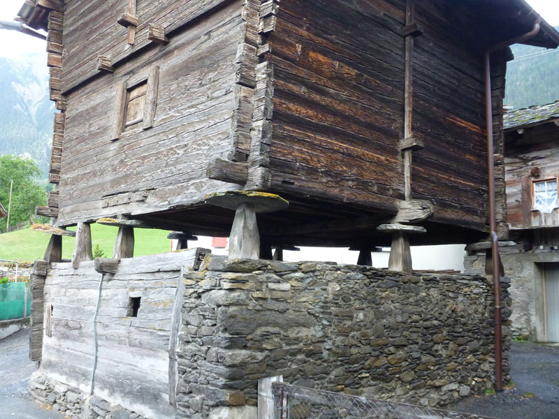 Einen kulturellen Tipp hätte ich aber auch noch, verbunden mit.einem Spaziergang durch Ried-Brig. Eine Besichtigung von sehenswerten Walserhäuser aus dem 16. Jahrhundert, sie beginnt schon direkt an der Schule. Wer auf dem letzten Kilometer zum heutigen Zieleinlauf noch in der Lage war, einen Blick auf die Bauweise zu werfen, wird da vielleicht schon neugierig geworden sein. Besonders die uralten Speicher mit den sogenannten Mäuseplatten sind eine Augenweide. Um Ratten und Mäuse am Eindringen zu hindern, wurde an den senkrechten Pfosten eine waagerechte Steinplatte aus Schiefer oder Granit eingebaut. Ihre Flächen waren so glatt behauen, dass sich Mäuse und Ratten an ihrer Unterseite nicht festklammern konnten. Diese Steinplatten sind heute eines der Wahrzeichen der alpinen Baukultur des Wallis. Besonderes Merkmal ist auch das Lerchenholz der Bauten. Die unbehandelten hellen Balken färbten sich unter der Sonne mit der Zeit schwarz. Ich streune etwas umher, entdecke auch alte Hornschlitten, wirklich höchst interessant.