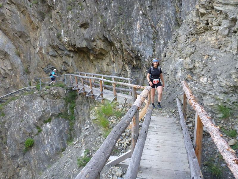 Streng geht es gleich los am frühen Morgen, hinauf zum Schallberg sind auf den ersten drei Kilometern sofort 350 Hm zu absolvieren. Meine Achillessehen benötigen eine längere Einlaufphase, daher befinde ich mich vom Start weg fast am Ende des Feldes. Nach einer halben Stunde gelangen wir wieder auf den Stockalperpfad mit herrlich abenteuerlichen Holzbrücken. Zum Teil fallen die Felswände hier fast 300 Meter senkrecht nach unten.