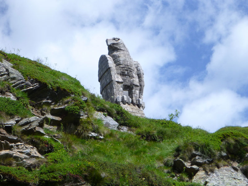 Auf dem Simplon-Pass (km 19) angekommen, gibt es wieder das Zeitlimit zu beachten. Um 12 Uhr sollten hier alle durch sein. Bestens ausgestattet ist wieder die Labestelle. Von oben grüßt ein steinerner acht Meter hoher Adler herunter, er ist das Wahrzeichen des Simplons. Wurde im Zweiten Weltkrieg als Symbol der Wachsamkeit von der Gebirgsbrigade gebaut.