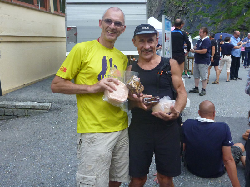 Jan und ich liegen gerade auf der Massagebank als die Siegerehrung beginnt. Als der Sprecher erwähnt dass alle Finisher aufgerufen werden, machen wir uns schnell auf die Socken um noch rechtzeitig vorstellig werden zu können. Zu unserer Überraschung bekommen alle einen Siegerpreis ausgehändigt. Spezialtäten vom Simplon: Birnschnitzbrot und 1 kg schwerer Laib Käse.