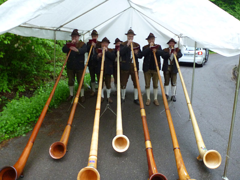 Über schwarze Pfade Um 9 Uhr wird gestartet, bequemerweise verlaufen die ersten Meter für uns bergab Richtung Grube Von der Heydt. Von den alten Schacht-Anlagen gibt es aber für Unwissende wie mich nichts mehr zu erspähen. Die Natur hat die gröbsten Spuren beseitigt. Dafür kann ich aber heimatliche Klänge vernehmen. Alphornbläser blasen uns den Marsch. Sind die extra wegen mir aus Bayern angereist? Natürlich nicht. Es sind alles Saarländer mit Liebe zu diesem exotischen Instrument.