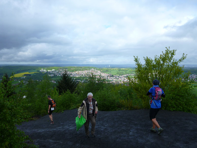 Nach 5 km erreichen wir die in Jahrzehnten aufgeschüttete Bergehalde Viktoria, ein Dokument harter bergbaulicher Arbeit. Ein kurzes Begegnungsstück führt uns auf den Gipfel des etwa 100 Meter hohen Spitzkegels. Auf dem schwarzen, zerklüfteten Bergematerial entstanden zusammen mit einigen umliegenden Feuchtgebieten äußerst vielfältige Lebensräume für Tiere und Pflanzen. Darunter für so seltene und gefährdete Arten wie Rohrweihe (Greifvogel), Ringelnatter und Zwergfledermaus. Die Halde gehörte zur gleichnamigen Grube, die 1963 geschlossen wurde. Fast 50 Jahre später sind die Flanken bereits vollkommen bewaldet. Es gibt sogar ein Gipfelkreuz. Hier bietet sich uns eine herrliche Aussicht über das Köllertal. Bei klarem Wetter kann man sogar bis Luxemburg blicken, erzählt mir Hendrik. Ein Trompeter bläst uns das Steigerlied.
