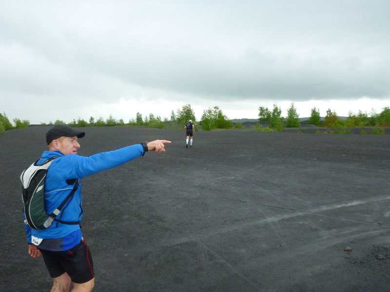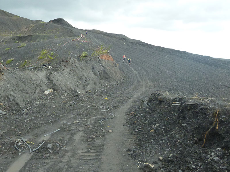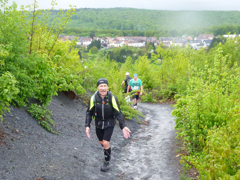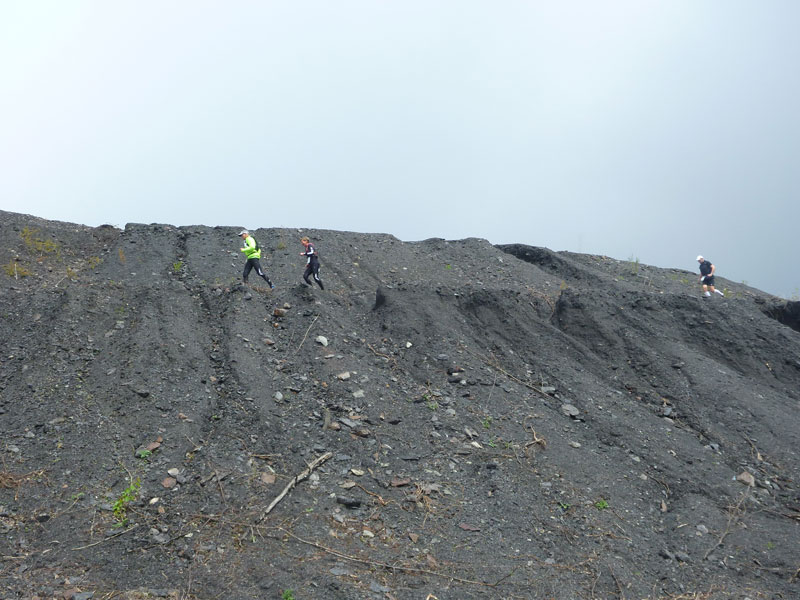 Halde Grühlingstraße ist für uns das letzte Bergbau-Überbleibsel. Ein steiler Aufstieg auf die Spitzkegelhalde eröffnet uns einen Blick nach allen Himmelsrichtungen. Auf gleichem Wege führt die Begegnungsstrecke wieder zurück, selbstverständlich mit Kontrolle. Von hinten sieht die Halde mit ihren steilen Erosionsrinnen noch beeindruckender aus. Die letzten fünf Kilometer werden für uns auf Schildern runtergezählt. Nach Überquerung der Fußgängerbrücke über die Autobahn A1 haben wir noch zwei Kilometer vor uns. Gutes Profil ist auf dem schlammigen Bergabstück gefragt. Gerade noch vor Ablauf der festgelegten Sollzeit von 8:30 Stunden erreichen wir das Ziel. Aber auch nachfolgende mit überzogenen Zeitrahmen werden noch erfasst und gewertet.