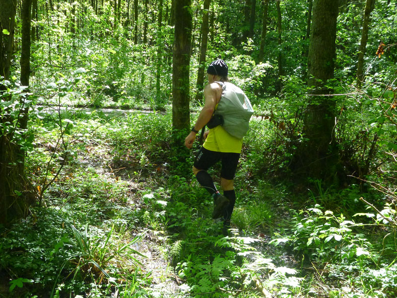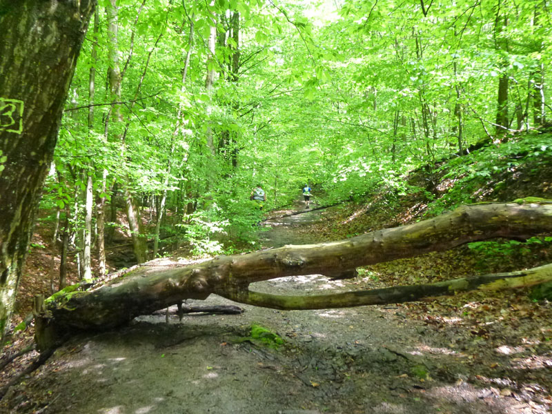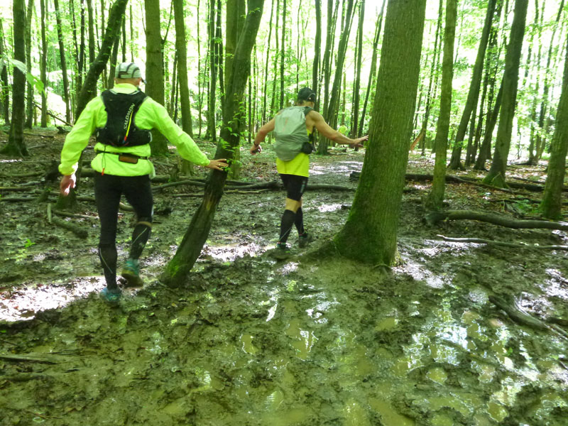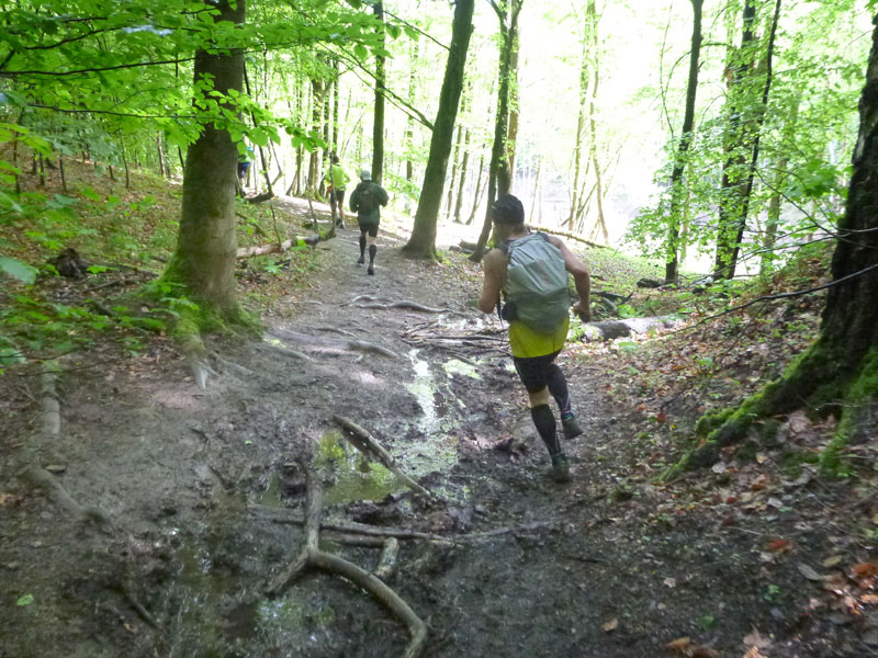 Vom kurzen Regenschauer haben sich bergab kleine Rinnsale gebildet, wer nicht aufpasst, kann sich schnell nasse Füße holen. Fünf Verpflegungs- und Getränkestationen werden uns angeboten, die erste erreichen wir an der Schutzhütte Riegelsberg bei km 8,6. Zur Pflichtausrüstung zählen neben einem Mobiltelefon auch eigene Verpflegung und mindestens ein Liter an Getränken. Danach wird’s erstmals richtig schlammig …ääh trailig wollte ich sagen. Von vorher oft noch befestigen Wegen geht es jetzt auf weichen Trampelpfaden mitten durch den Wald. Ein Mitläufer ist davon wenig begeistert, ich find’s super.