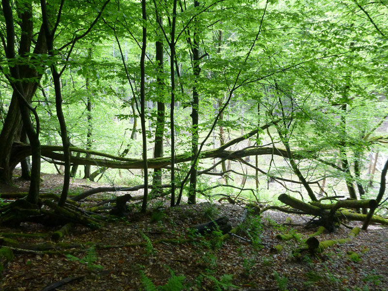 Bei km 16 tauchen wir ein in ein märchenhaftes, über tausend Hektar großes Waldgebiet. Willkommen im Urwald. Seit 1997 wird dieser Abschnitt inmitten des Saarkohlenwaldes nicht mehr forstwirtschaftlich genützt und so entsteht diese Wildnis. Schlagartig ändert sich unser Terrain. Es ist ein Traum für Trailer. Farne und Sträucher wuchern wild über die Pfade. Vermoderte Bäume liegen einfach quer über den schmalen Wegen und die Trails sind weich und ausgewaschen vom Regen und oftmals natürlich auch etwas matschig. Zugegeben, manchmal hat man auch künstlich etwas nachgeholfen und so etwas wie Treppenstufen in die kreuzenden Baumstämme gesägt um das übersteigen etwas zu erleichtern und natürlich überqueren wir breitere Bachläufe auch auf von Menschenhand errichteten Holzbrückchen.