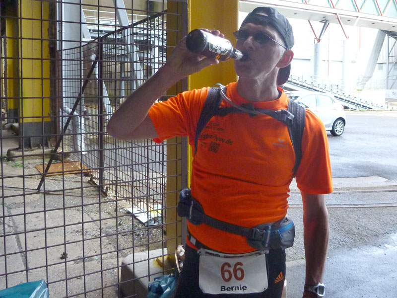 Fast direkt darunter können wir uns am dritten Verpflegungspunkt noch einmal stärken, die reichlich bestückt ist. Dank Joe’s verzweifelter Suche im Vorjahr nach hopfenhaltiger Flüssignahrung wurde heuer an die meisten VPs auch Sixpacks ausgeben. Bei Halbzeit unseres Trails genehmige ich mir zur Belohnung ein Fläschchen. Dazu wird „der“ Lyoner serviert. In der saarländischen Mundart ist sie männlich und die Fleischwurst gilt als typisch saarländisch.