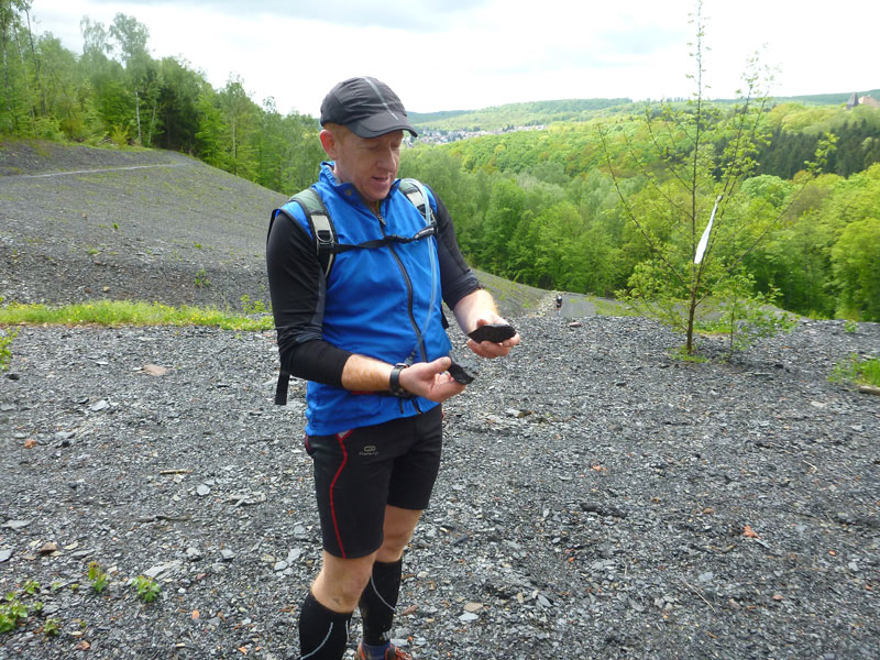 Bis zur Halde Brefeld (km 41) sind auch einige kürzere Abschnitte auf ungeliebten Teerboden zu überbrücken. Unter dem tauben Gestein der Halde zeigt mir Frank einige Kohlestücke. Seit Stilllegung der Grube Brefeld im Jahre 1962 verschwindet sie mehr und mehr unter einem grünen Waldmantel. Nach einem kurzen Aufstieg über die Abraumhalde verschwinden wir im Baumbestand. Ein herrlicher, schmaler Singletrail befördert uns wieder hinab.