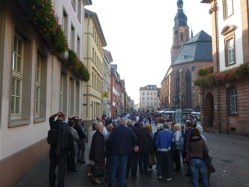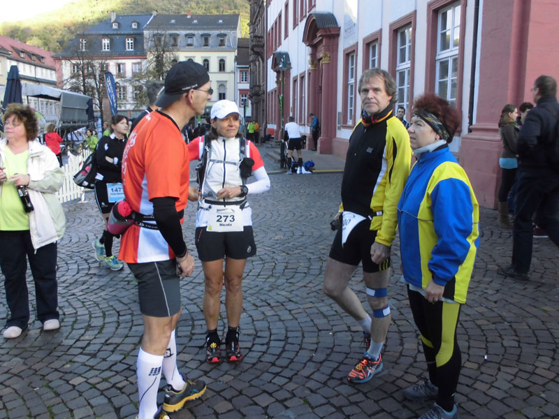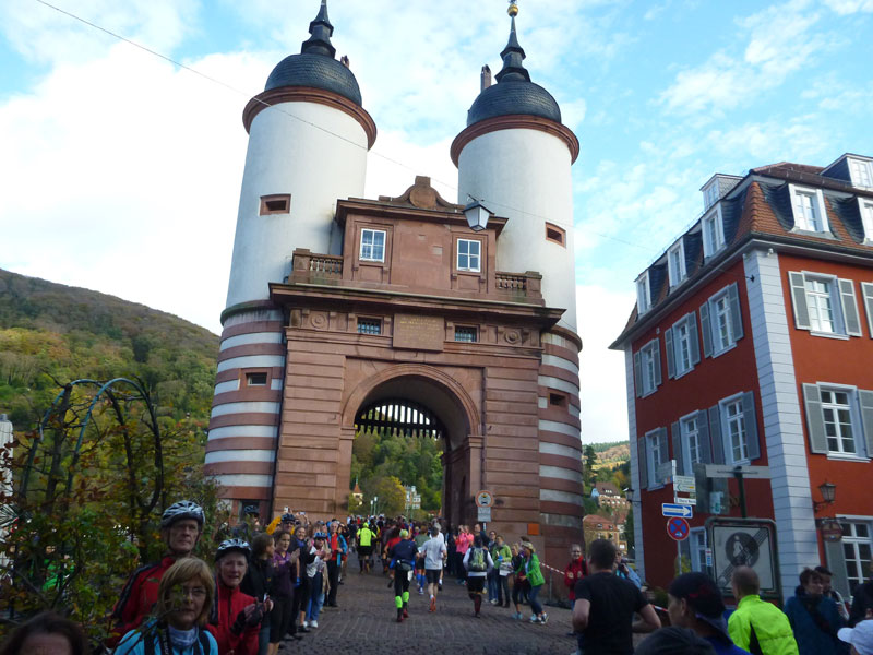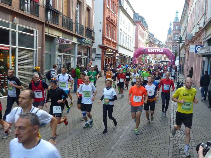Um 9 Uhr wird gestartet, ein Sprecher und fetzige Musik sorgen vorher noch für etwas Unterhaltung. Von großen Ansprachen, Reden oder Ähnlichem bleiben wir verschont. Nach der Startgeraden geht es unmittelbar in die 1,6 km lange Fußgängerzone, welche sich durch die gesamte Altstadt zieht und eine der längsten und schönsten in Europa ist. Nach Zerstörungen um 1700 wurden die Gebäude auf ihrem mittelalterlichen Grundriss im Barockstil errichtet und sind meist noch gut erhalten. Als eine der wenigen deutschen Großstädte wurde Heidelberg auch im zweiten Weltkrieg nicht bombardiert.