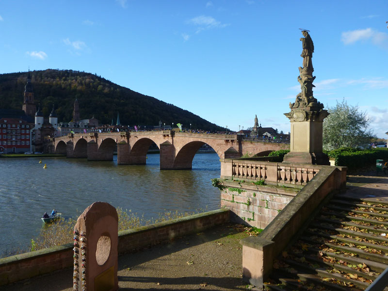 Durch ein mittelalterliches Brückentor mit zwei imponierenden Doppeltürmen aus dem 17. Jahrhundert gelangen wir auf die Alte Brücke. Am Tor mussten Auswärtige seinerzeit Brückenzoll entrichten, im Verteidigungsfall konnte es durch ein Falltor verschlossen werden. Über die Brücke aus Neckartäler Sandstein überqueren wir den Fluss. Sie gehört zu den bekanntesten Sehenswürdigkeiten Heidelbergs. An einem der letzten Kriegstage sprengten deutsche Soldaten alle Heidelberger Neckarbrücken, so auch die Alte Brücke. Dank einer Spendenaktion konnte bereits 1946 mit dem Wiederaufbau begonnen werden. Drei flache Kilometer sind jetzt absolviert.