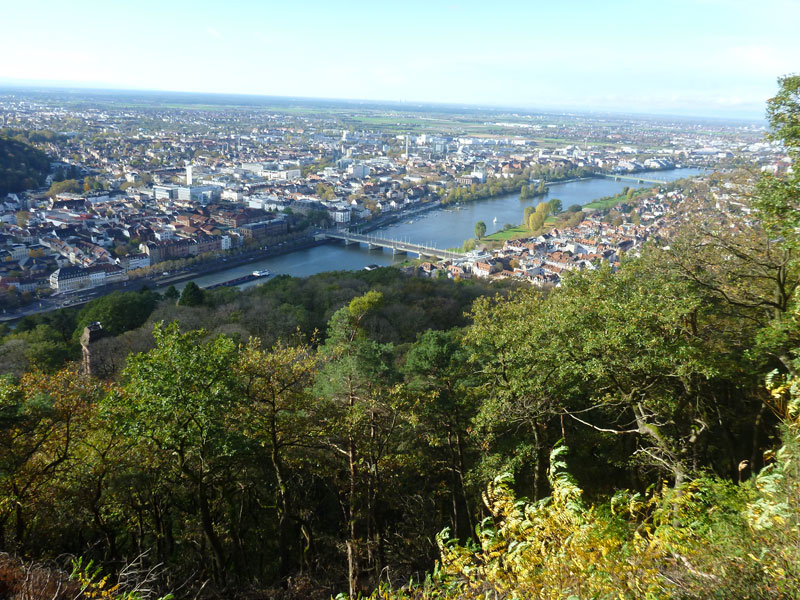 Die erste kräftige Steigung erwartet uns in der Hirschgasse, sie führt hinauf auf den Philosophenweg, wo sich uns erste wunderbare Ausblicke über Neckar, Altstadt und Schloss eröffnen. Der Philosophenweg zählt im Übrigen zu einer der wärmsten Stellen Deutschlands. Der Hang hat wegen seiner Süd- und 45 Grad-Steillage sowie wegen des Erwärmungseffektes durch Fallwinde sehr spezielle klimatische Verhältnisse. Die Durchschnittstemperatur liegt hier 1,5°C höher als die des Stadtgebietes. Seinen Namen bekam er von den Gelehrten, die hier einst in steifen Gehröcken wandelten und ihre Gedanken beim Spaziergang lockerten. Einen knappen Kilometer dürfen auch wir auf ihren Spuren wandeln und unsere Beine vom ersten Anstieg lockern, dann geht’s weiter auf die Höhe.