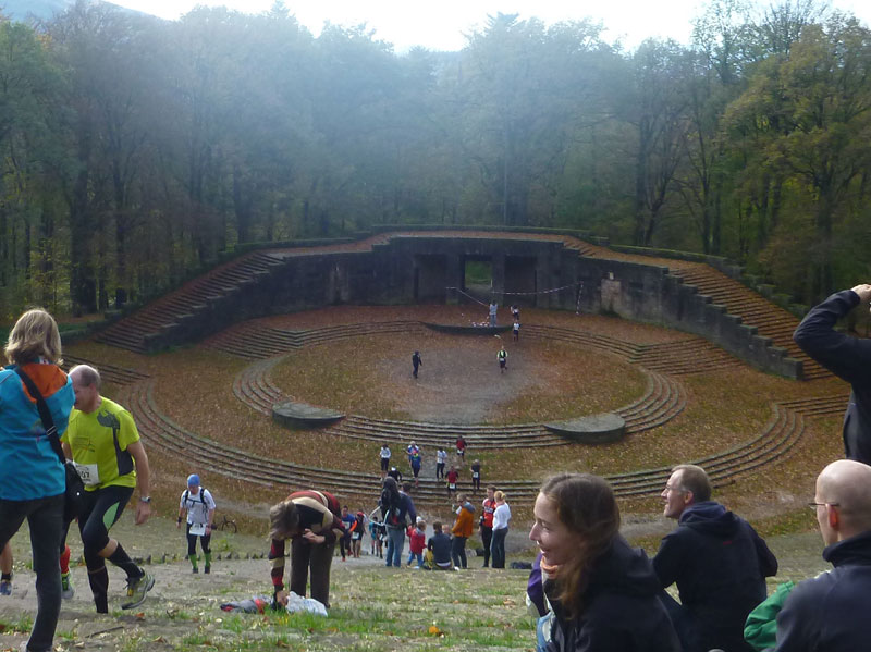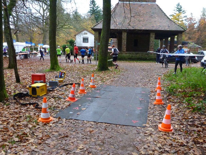 Auf unterschiedlichem Terrain, ohne technisch schwierige Abschnitte, aber dafür meist im Anstieg gelangen wir zum Weißen Stein (km 17), dem zweithöchster Punkt des Kurses auf 548 Meter. Über 500 Höhenmeter beinhaltet der Abschnitt. Eine Zeitmessmatte bestätigt unser ordnungsgemäßes Passieren. Der Weiße Stein ist im Übrigen der Name des Berges. 1906 wurde hier von Mitgliedern des Odenwaldklubs ein 20 m hoher Aussichtsturm aus Stein gebaut, der bei gutem Wetter eine schöne Aussicht auf andere Berge des Odenwalds bot, heute ist er aber durch hohe Bäume weitgehend zugewachsen.