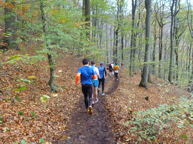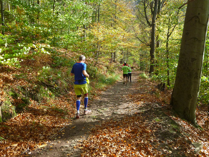 Unmittelbar danach führt uns auch erstmals ein echter Trail einige hundert Meter bergab. Nach einem kurzen Gegenanstieg können wir auf einem gleichmäßig abfallenden Waldweg schön Fahrt aufnehmen. Dickes Laub auf den Wegen macht es einem gar nicht immer leicht, die wahre Beschaffenheit des Untergrundes zu erkennen, aber ich spüre, da ist viel Asphalt dabei. Über fast drei Kilometer zieht sich der Downhill hinunter ins Mühlental bis zur ersten Wechselstelle der Fünferstaffeln (km 11,5) hin.