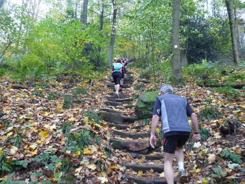 Danach geht’s wieder auffi. Erst noch mäßig bis etwa km 34, aber ab hier wartet der Aufstieg zum Gipfel des Königstuhl auf uns. Mit dem Einstieg in die sogenannte Himmelsleiter, einer Sandsteintreppe mit über 600 grob behauenen und unregelmäßigen Stufen, verbunden mit 250 Höhenmetern, wird auch der „Trail Marathon“ seinem Namen gerecht. Die relativ bequeme Lauferei ist hier zu Ende. Wo wahrscheinlich für viele Straßenläufer jetzt der Alptraum beginnt, fängt bei mir und anderen Trailern erst so richtig der Spaß an.