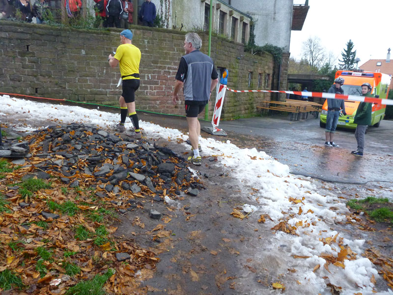 Mit 567 m ist der Königstuhl der höchste Punkt unserer Strecke (km 35). Hier hat sich der Veranstalter eine nette Überraschung für uns einfallen lassen. Wir werden mit Schneeboden begrüßt. Etwa 20 Meter lang ist der alpine Abschnitt. Einige Kubikmeter Schnee, der bei der Eispräparation anfällt, wurde aus der SAP Arena in Mannheim herbei geschafft.