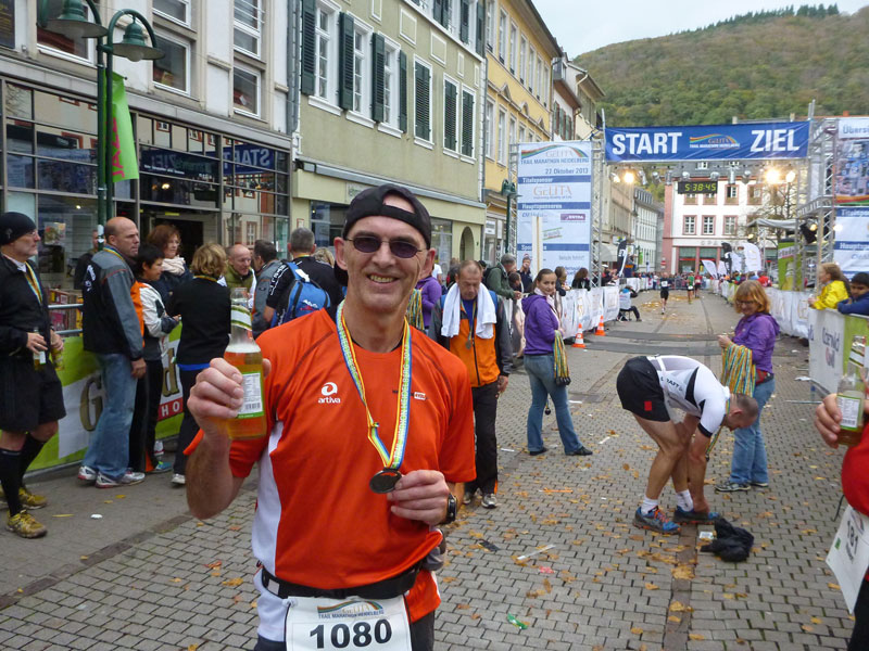 Die Flamme rouge, so wird der letzte Kilometer bei den Etappen der Tour de France bezeichnet, beginnt am Eingang zur Altstadt. Man hat uns eine Gasse mitten durch die Fußgängerzone freigehalten. Rechts und links wird sie von viel Publikum gesäumt und man spendet uns tüchtig Beifall. Im Ziel auf dem Universitätsplatz werde ich mit einer schönen Medaille belohnt. Sieben Stunden gibt man den Marathonis Zeit, sich den verdienten Lohn abzuholen.
