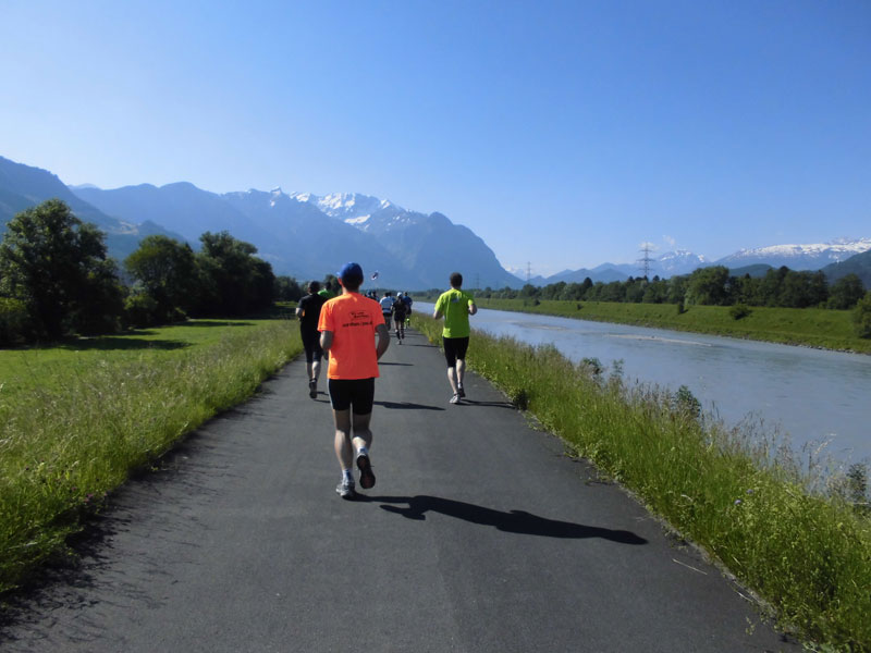 Pünktlich um neun Uhr ging es schließlich los. Auf einer Bundesstraße liefen wir in Richtung Schaan bzw. Vaduz und nach etwa einem Kilometer bogen wir nach rechts auf einen Feldweg ab, um kurz darauf weiter am Rhein entlang in Richtung Vaduz zu laufen. Brettleben ist hier die Strecke auf den ersten zehn Kilometern, doch vor einem sieht man die Alpen mit ihren noch schneebedeckten Gipfeln. Herrlich. Mit einem Schnitt von knapp unter sechs Minuten war ich zwar etwas schneller unterwegs als geplant, aber was soll's. Ich fühlte mich gut und zudem entdeckte ich vor mir ein altbekanntes Shirt. Es war orange und trug die Aufschrift „marathon4you“. Andreas Bettingen aus München war genauso wie ich mit einer Kamera bewaffnet und suchte nach Motiven. Wir unterhielten uns eine ganze Zeit lang, bevor wir uns kurz vor Vaduz verloren.