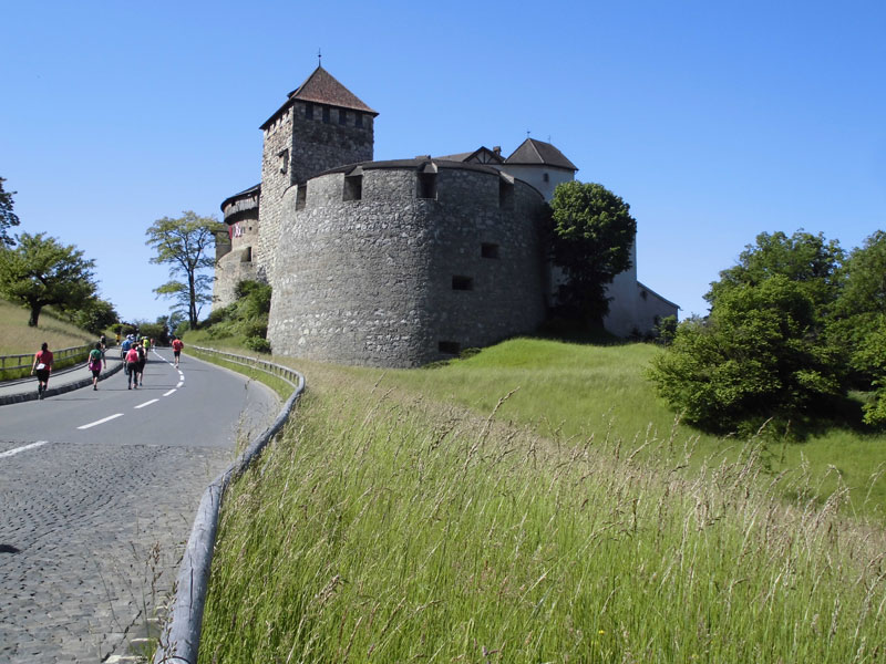 Denn kurz vor dem Rathaus bogen wir in der Innenstadt nach rechts ab und schon ging es steil bergauf. Vorbei war es mit dem Geradeauslaufen. Der Anstieg führte uns auch am Schloss Vaduz vorbei. Es ist das Wahrzeichen von Vaduz und im Privatbesitz der fürstlichen Familie. Daher kann es auch nicht besichtigt werden. Es dient zum Empfang von Staatsgästen und ähnlichen Feierlichkeiten. Nachdem wir auf der Straße weitere Höhenmeter erklommen hatten, leitete uns einer der freundlichen Streckenposten nach links auf einen schmalen Waldpfad. Natürlich ging es hier weiter nach oben. Doch inzwischen war ich schon froh im schützenden Schatten der Bäume laufen zu dürfen.