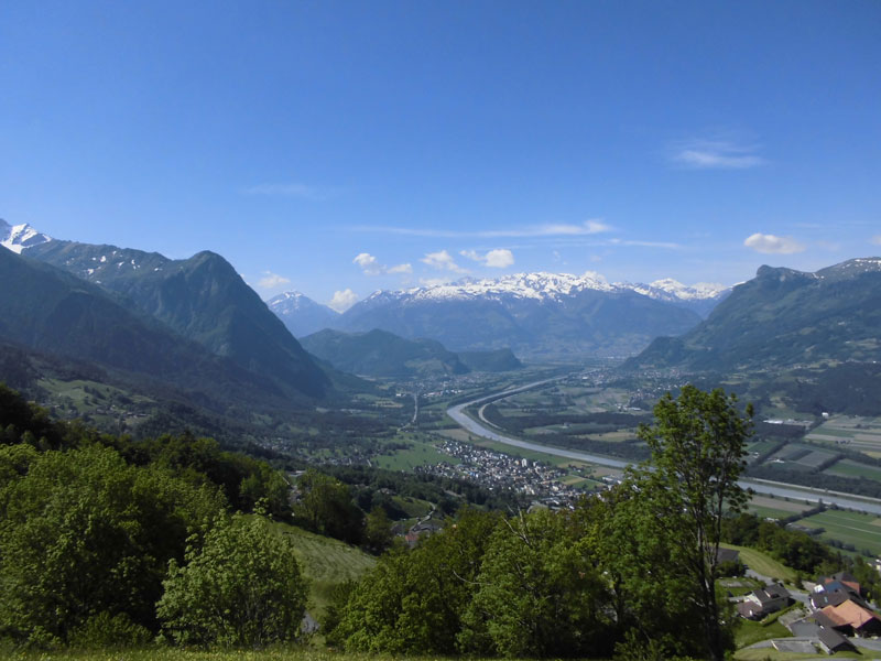 Die Sonne hatte eine enorme Kraft und die 28 Grad vom Vortag dürften auch am Lauftag locker wieder erreicht worden sein. Aus dem Wald heraus liefen wir wieder auf einer Straße. Es ging in Richtung Triesenberg und ich machte unterwegs nicht nur die 15 Kilometer voll, sondern auch die tausend Höhenmeter. Wahnsinn. Wenn man bedenkt, dass wir bei etwa 450 Hm gestartet sind und die ersten 10 km eben waren. Die Aussicht war inzwischen auch der Wahnsinn. Im Tal unten lag Vaduz, durchzogen vom Rhein, der von hier oben nicht breiter als ein Bach wirkte. Die Berge. Der blaue Himmel. Einfach ein Traum.