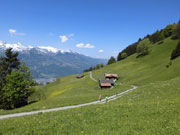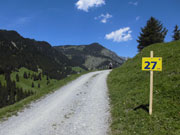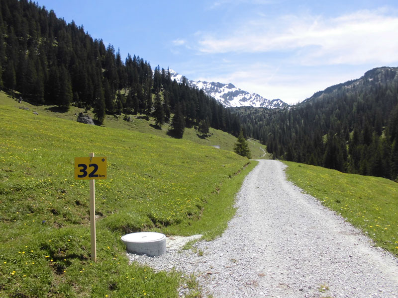 Auf einem breiten steinigen Feldweg ging es kontinuierlich nach oben. Alles in der prallen Sonne. Das schlauchte dann doch. Vor allem ging's immer nur bergan. Ein kurzer Bergablauf zur Erholung war Fehlanzeige. Daher war von meiner guten Laune auch bald nichts mehr übrig. Ein Spanier der unmittelbar vor mir lief, schien auch nicht besser drauf zu sein und so schlugen wir uns zusammen rund um das Valorsch-Tal weiter. Ich sehnte mich nach Schatten, der einfach nicht kommen wollte. Doch ein weiterer Einödhof lag an der Strecke. Der Bauer war gerade damit beschäftigt, seinen Traktor abzuspritzen. Mit kaltem Gebirgswasser! – Na wenn, das mal keine Möglichkeit zur Abkühlung ist. Kurz nachgefragt, überließ er mir großzügig seinen Schlauch und wünschte mir zum Abschied noch einen guten Aufstieg.