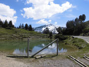 Ach ja, und während ich ratschender Weise so vor mich hinlaufe, ist der höchste Punkt auch schon überwunden und es geht bergab. Schon bald kann man Steg erkennen. Zwei strahlend blaue Seen und ein herrlicher Gebirgsbach, sowie ein paar Häuser kommen immer näher. Schon bald ist auch der Sprecher zu hören, der jeden einzelnen Läufer namentlich im Ziel begrüßt. Für mich gab es bis jetzt keinen Grund an`s Aufhören zu denken. Dies wäre hier nämlich möglich gewesen. Wolfgang erwartete mich kurz vor dem Halbmarathon-Ziel und fragte nach meinem Befinden. Alles super, erklärte ich ihm und wollte mich auch gar nicht lange aufhalten. Zwei schnelle Fotos und weiter ging`s.
