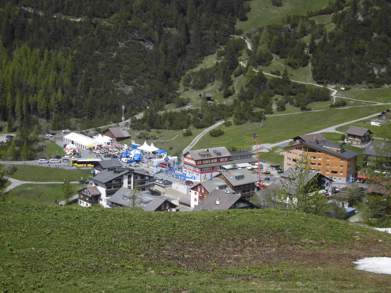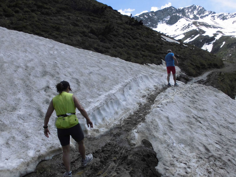 Jetzt ging es langsam aber stetig bergab. Nur gelegentliche Anstiege ließen meinen Puls ebenfalls ansteigen. Etwas gemein sind die letzten vier Kilometer. Hier ist das malerische Malbun, das in einem Kessel liegt noch zu umrunden. Durch Restschneefelder geht's in welligem Gelände einmal um die Ortschaft herum. Dass man dabei ständig den Zielsprecher hört, der auch hier jeden Finisher namentlich begrüßt, ist nicht sehr motivierend, da man doch schon am Ende seiner Kräfte ist. Mit einer Schweizerin, mit der ich mir diesen Streckenabschnitt teilte, lieferte ich mir noch eine kurze und erfrischende Schneeballschlacht. Tja, und dann war es irgendwann so weit. Steil ging es hinab in Richtung Malbun und der letzte Kilometer lag vor mir. Den Zielsprecher konnte ich nun auch deutlich verstehen.