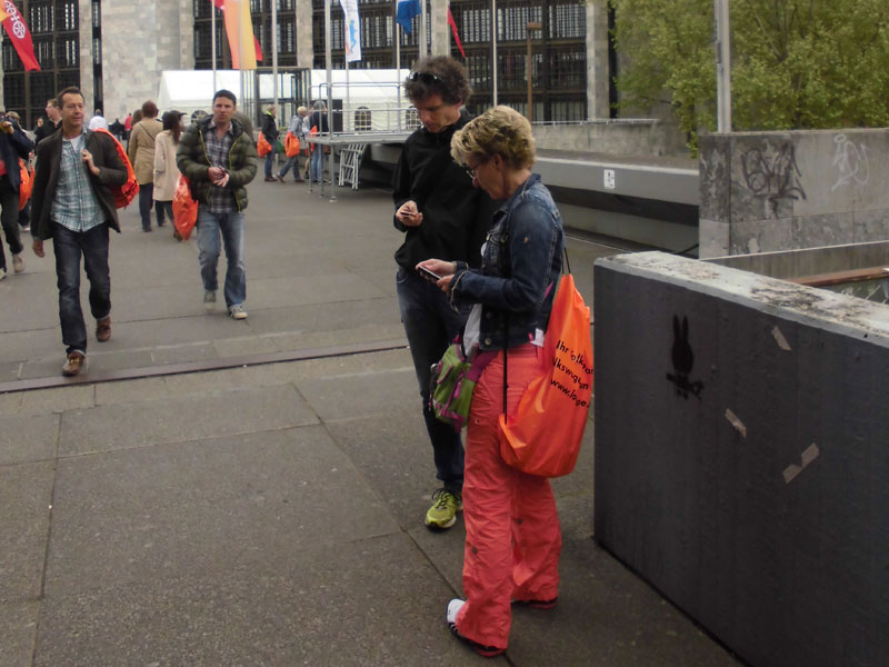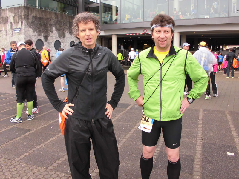 Der Regen hatte inzwischen ein Einsehen mit uns und hatte sich verzogen. Die Temperaturen waren nicht unbedingt im Wohlfühlbereich, aber doch auszuhalten. Kurz nach neun Uhr fanden wir uns hinterhalb des Rathauses auf der Rheinallee ein. Den vorgegebenen Startblock zu finden war irgendwie nicht einfach, so reihten wir uns einfach irgendwo ein. Im Nachhinein denke ich, dass wir zu weit hinten waren, denn am Anfang ging es bei unseren Mitstreitern doch sehr bedächtlich zu. Weit über 10.000 Läufer hatten sich nämlich im Startbereich eingefunden. Halb-, Dreiviertel- und der ganze Marathon wurden zeitgleich um halb zehn gestartet. Lediglich die Handbiker durften eine viertel Stunde vor uns auf die Strecke.