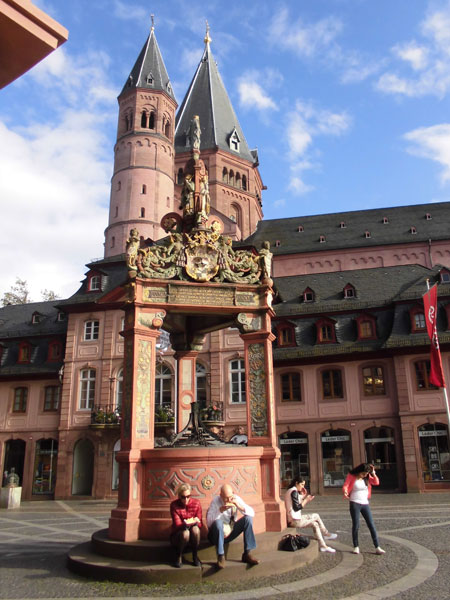 Danach entließ man uns in Richtung Mainz-Mombach, eine Mischung aus Industrie- und Wohngegend, also unspektakulär. Dennoch hatten sich auch in diesem Bereich einige Zuschauer eingefunden, die wohlwollenden Applaus spendeten. Etwa bei Kilometer 11 fühlte man sich kurz nach Rom bzw. in den Vatikan versetzt. Die Kuppel der evangelischen Christuskirche erinnerte mich stark an die des St. Peter Doms in Rom. Einmal um die Kirche herum ging es weiter in Richtung Landesmuseum Mainz, gut zu erkennen an einem großen goldenen Pferd, Entschuldigung ich wollte natürlich Ross schreiben. Nun näheren wir uns schön langsam aber sicher wieder dem alten Mainz, das Wolfgang und ich am Tag zuvor ja schon besichtigt hatten. Am Gutenbergplatz thront zur Linken das Staatstheater. Das historische Gebäude bekam eine markante Glaskuppel aufgesetzt. Bei welchem Marathon hatte ich so etwas nur schon gesehen … Hmm? Ich glaub, da kam ich nahe dem Reichstag ins Ziel und war ähnlich gut unterwegs wie heute. Rechterhand erblickten wir den bedeutendsten Sohn der Stadt: Johannes Gutenberg – wie schon erwähnt den Erfinder des Buchdrucks – in Bronze. Das erfuhr ich allerdings nicht erst in Mainz – in meiner alten Wirkungsstätte Olching in Oberbayern war sogar eine Straße nach ihm benannt.