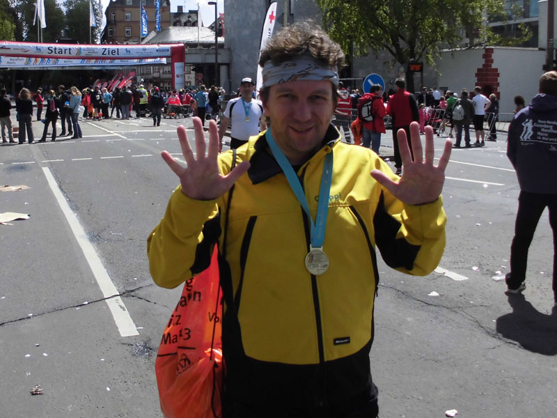 Mit 4:14:21 Stunden hatte ich doch eine „Nach-dem-Bandscheiben-Vorfall“-Bestzeit gelaufen und war hochzufrieden. Keine Sekunde trauerte ich um die verpasste Sub4. Wolfgang war genaue eine Sekunde schneller als ich, Kati hatte rund vier Minuten Vorsprung auf uns. Wir versorgten uns noch kurz mit Cola und ähnlichen Getränken, danach hieß es von Kati Abschied zu nehmen. Wolfgang und ich machten uns auch bald auf den Weg in Richtung Hotel. Am Fastnachtsbrunnen machten wir noch kurz Halt und relaxten in der inzwischen kräftigen Sonne. Bevor ich mich ins hoteleigene Schwimmbad unseres Hotels begab, konnte ich sogar noch den Sieg von Fernando Alonso im Fernsehen mit verfolgen. Filipe Massa auf Rang drei. Für mich als Ferrari-Fan seit Kindheitstagen war die Welt für heute in Ordnung. Abends noch zum guten Italiener und am nächsten Tag hing es nach Hause.