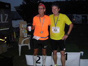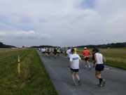 Weiter geht's über Feldwege und auf schmalen Teerstraßen bis nach Himbergen, einem kleinen Ortsteil von Bissendorf. Dort treffen wir auf weitere Lauffreunde, die uns anfeuern. Ein Anwohner hat sogar eine Dusche für uns aufgebaut, die bei der ersten Runde von einigen Läufern dankbar angenommen wird. Eine Gruppe Jugendlicher hat es sich am Ortsende bequem gemacht und sorgt für ordentliche Stimmung. |