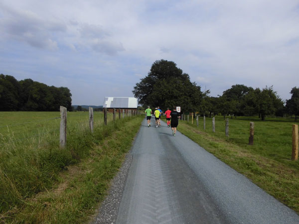 Direkt vom Schulzentrum aus geht es nun los. Auf Asphalt laufen wir einen ersten sanften Anstieg rund einen Kilometer nach Osten, biegen danach gleich wieder nach rechts ab und sanft geht es wieder hinunter. Wenn man das hier als hügelig bezeichnet, denke ich mir, ist alles in Ordnung. Dennoch lasse ich Vorsicht walten. Wer weiß, was noch kommt. Immer wieder kommen wir durch kleine Höfe, die kaum als Ortschaften zu bezeichnen sind, aber die Landschaft ist toll. Nicht so eben wie ich mir vorgestellt hatte, aber auch nicht wirklich hüglig, wie`s in der Ausschreibung steht.