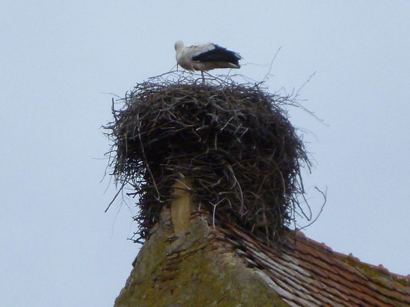 Oben auf den Dächern der alten Gebäude brüten die Störche, ihre Flugvorführungen haben mich im Vorjahr fasziniert, heute ist das anders. Auf den ersten Blick ist nichts zu sehen von Le Cigogne Blanche, dem inoffiziellen Elsässer Wappentier. Vielleicht ist ihnen zu kalt, obwohl Störche der Kälte besser trotzen können als andere Zugvögel. Viele der hier ansässigen Weißstörche haben ihre Reiselust verloren, auch dank der Fütterung durch Menschenhand, und überwintern im Elsass. Erst bei genauerem Suchen sind die ersten in ihren Nestern in den Bäumen und umliegenden Hausdächern zu entdecken.