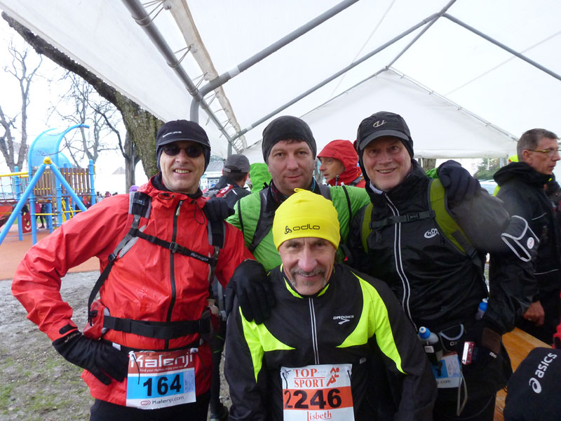 Der Startort ist einige hundert Meter entfernt vom alten Rathaus am Place des Humanistes. Es regnet leicht vor sich hin, freie Plätze unter Zeltplanen sind so begehrte Unterstellplätze. Das Wetter hat leider in der Nacht umgeschlagen, weiter oben am Petit Ballon ist mit Schnee zu rechnen, wahrscheinlich auch mit mehr als den wenigen Zentimetern, von denen mir gestern Organisator Christophe Acker erzählt hat. So stellt sich für mich wenigstens nicht die schwierige Kleiderfrage. Lange Hose und Regenjacke, dazu Wechselkleidung in den Rucksack wähle ich ohne lange zu überlegen.