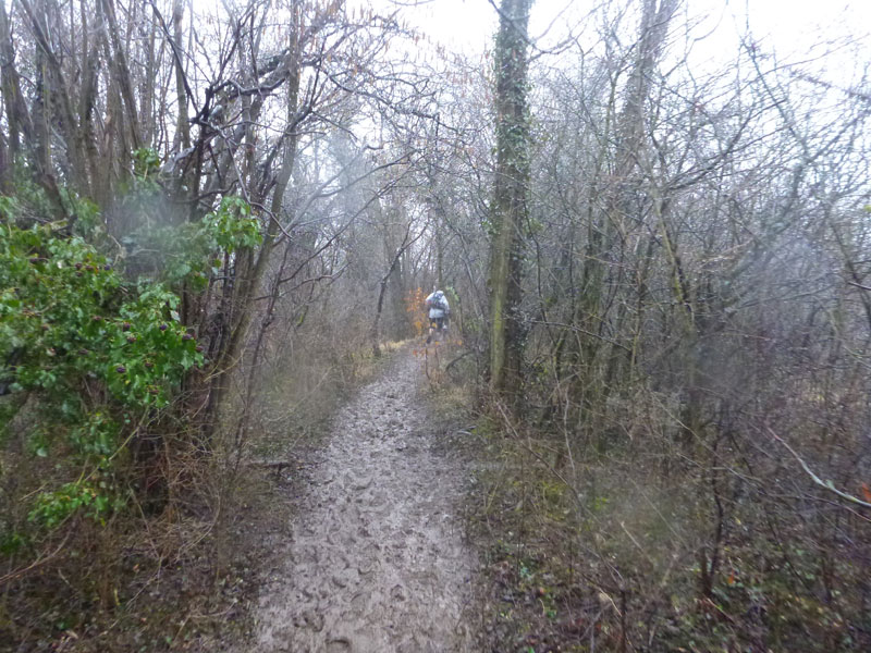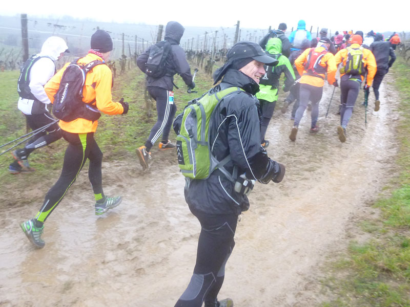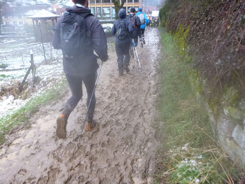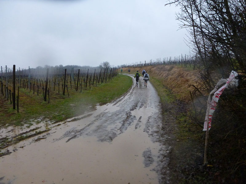 Um Punkt 9 Uhr werden wir von Christophe im leichten Regen und bei vielleicht 2 – 3 Grad plus auf die Strecke geschickt. Nach ein paar hundert Metern durch Rouffach erreichen wir die umliegenden Weinfelder. Schon auf den ersten Metern zeichnet sich ab, dass es schwierige, um nicht zu sagen: schmierige Bodenverhältnisse geben wird. Wenn man so will, also ideales Trailerwetter.