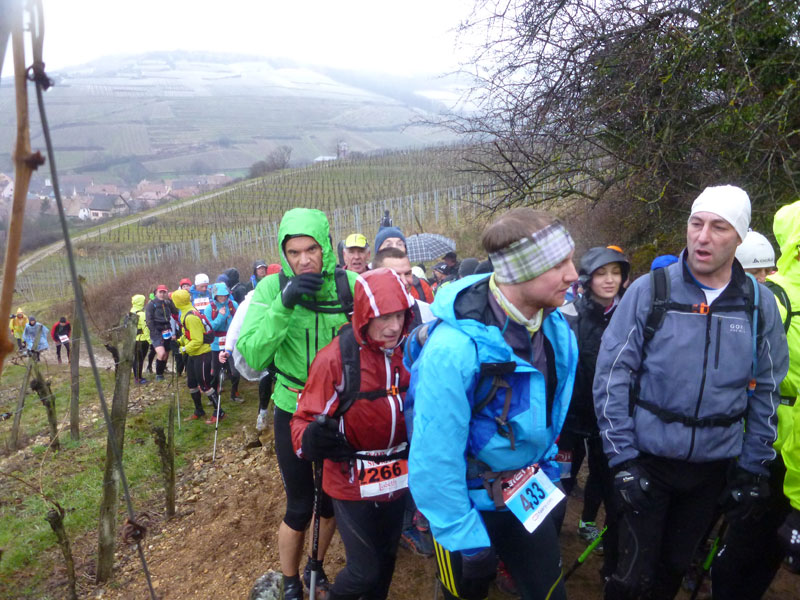 Immer mehr nehmen die Überholvorgänge zu. Vom fast 1.000 Teilnehmer fassenden Grands-Crus-Feld haben mich bestimmt schon die ersten einhundert überholt. Bei mir löst dieser turbulente Verlauf eine ziemliche Unruhe aus. Á gauche, à gauche, à gauche, sie scheinen sich abgesprochen zu haben, immer ertönt dasselbe Kommando um Platz zu machen. Menno, ich bin jetzt langsam richtig genervt, ständig auf den engen Trails in den Schnee ausweichen zu müssen. Mit dem kurzen zeitlichen Start-Abstand hat der Veranstalter keine gute Wahl getroffen, das gab es in der Form auf der gegenläufigen Strecke so früh nicht. Ein Ende hat das Treiben erst in Osenbach (km 15,3), hier trennen sich endlich unsere Kurse. Der Circuit des Grand Crus führt zurück Richtung Rouffach. |