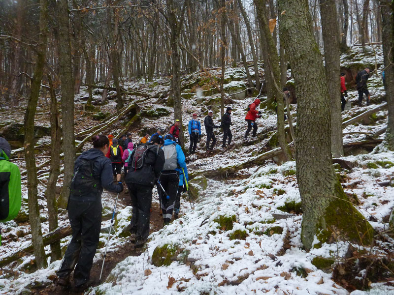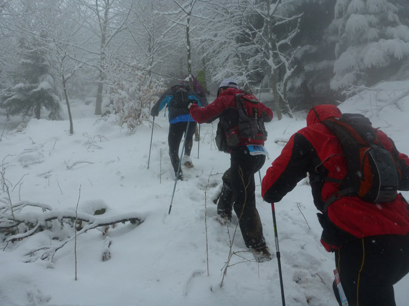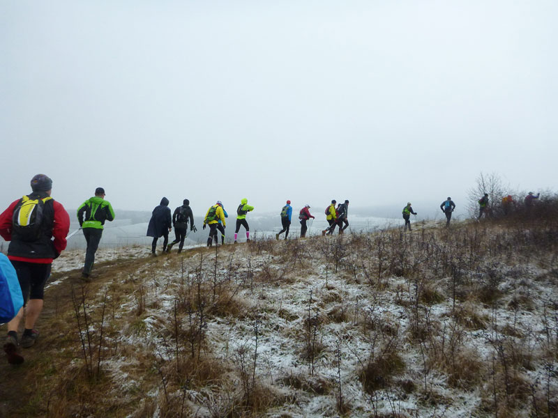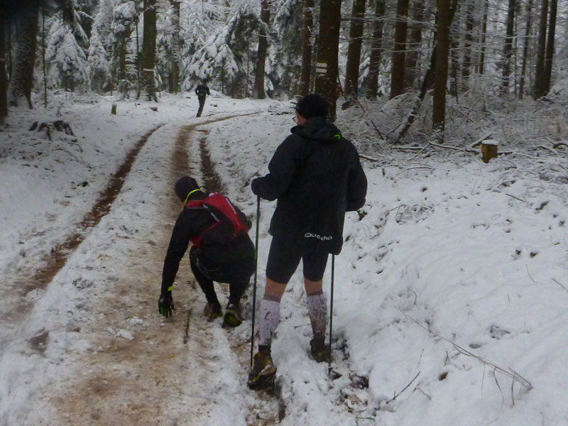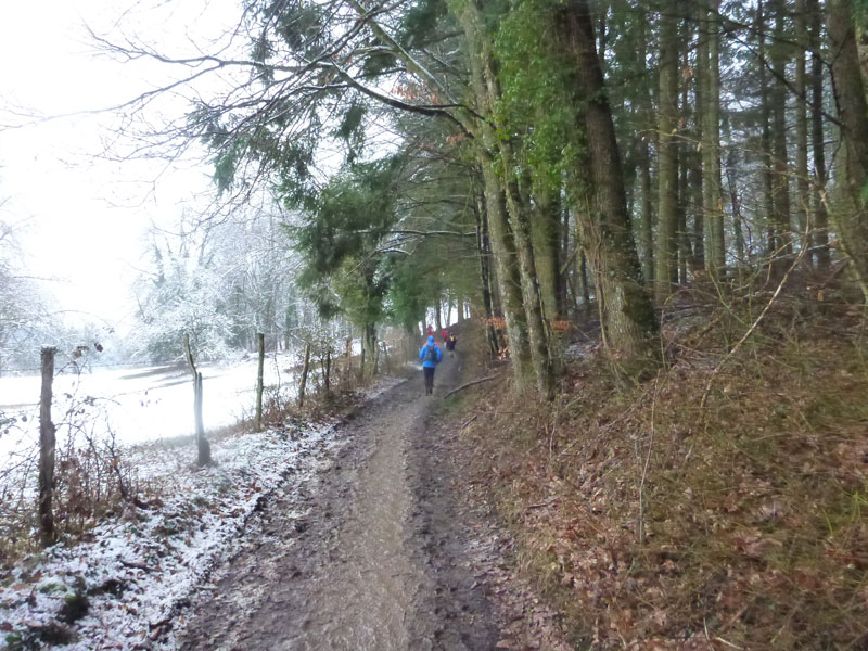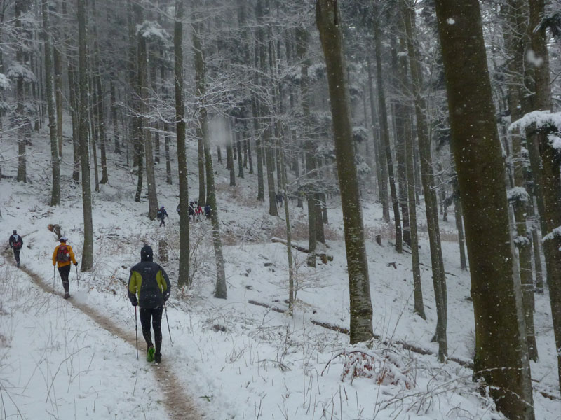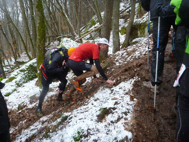 Immer mehr der „Kurzstreckler“ laufen von hinten auf uns auf. Mit „à gauche“ dirigieren sie uns im Schweinsgalopp an die Außenkante des Abhangs. Sie wollen innen, linksseitig an uns vorbei, was des Öfteren für kritische Situationen sorgt und zuweilen recht unwillkommen ist, da es nicht immer ganz so einfach auf die Schnelle zu bewerkstelligen ist. Abschnittsweise sind die schmalen Pfade spiegelglatt wie in der Rinne einer Eisbahn, was zu ersten Stürzen führt. In Schauenberg (km 9,5) gibt es die Möglichkeit zum Verpflegen. Warme Getränke stehen leider nicht zur Verfügung.